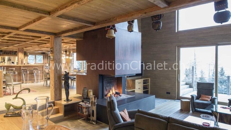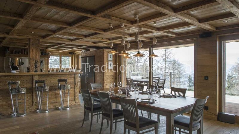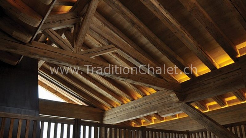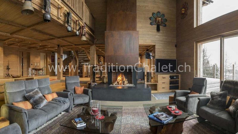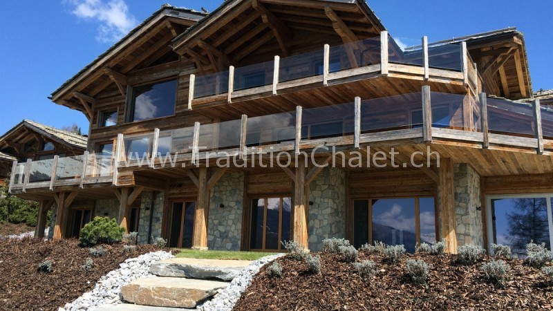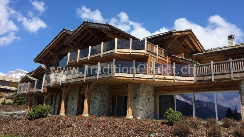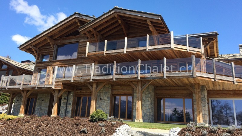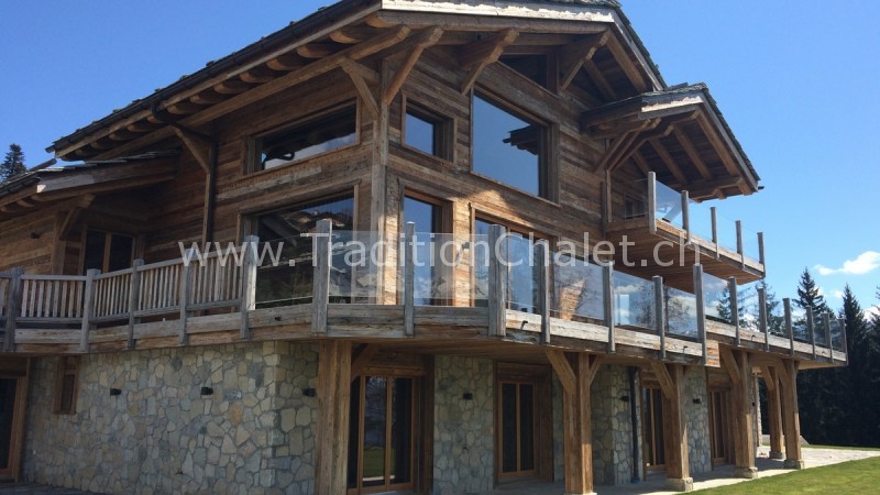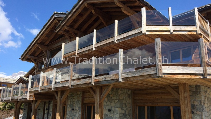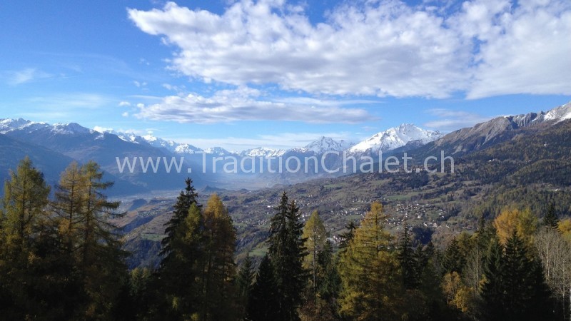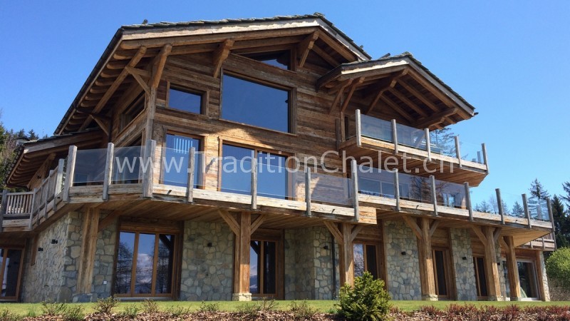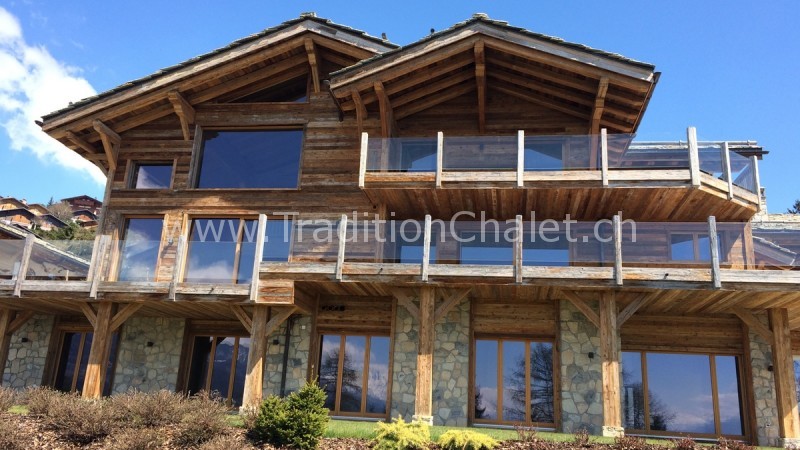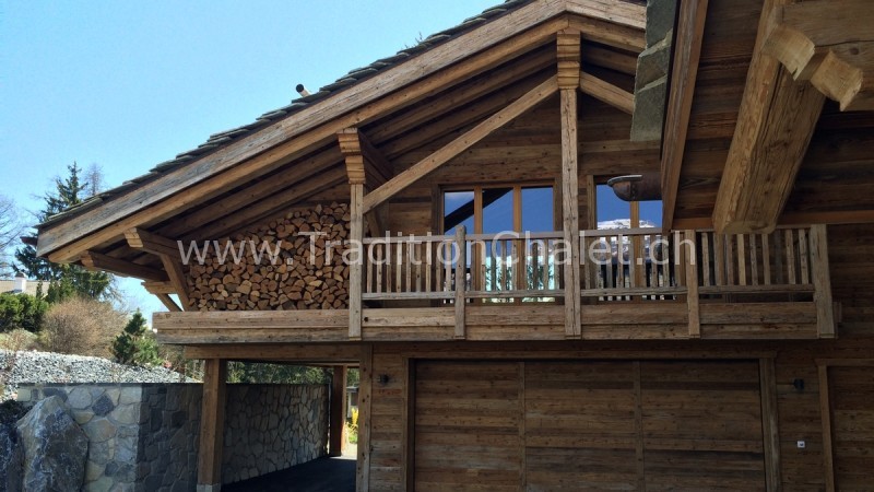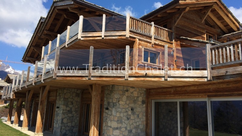 Luxueux chalet en vieux bois avec vue sud-ouest imprenable sur la vallée du Rhône et ses montagnes.